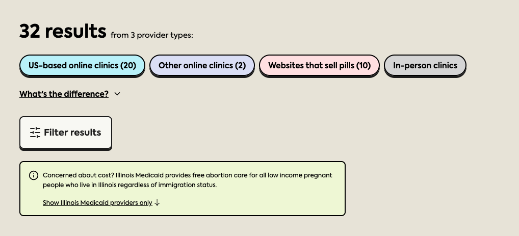 Another existing filter shows providers that accept Medicaid. That’s now enhanced with a box above the results that reads: “Concerned about cost? [X state] Medicaid provides free abortion care for all low-income pregnant people who live in [X state] regardless of immigration status. Show [X state] Medicaid providers only.” Plan C felt this callout was necessary because some people are paying for pills they could get for free. “It's a real issue,” Merrill said, noting that highlighting services that accept Medicaid is part of “the mission to make sure people understand all the options that are out there right now.”