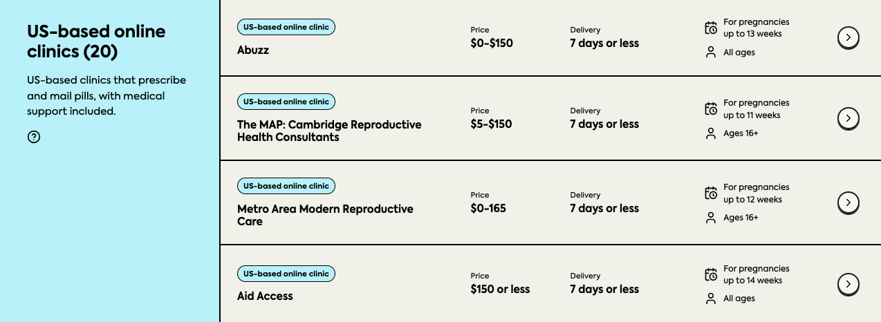 Visitors to state pages will now see provider data presented in rows and columns, rather than separate boxes, so they can easily compare services. Users have more filtering options, too: They can sort by interaction type (i.e., whether or not a video visit is required), weeks of pregnancy, ages served, and languages spoken. An existing filter allows visitors to select providers that offer pills for future use, known as “advance provision.”