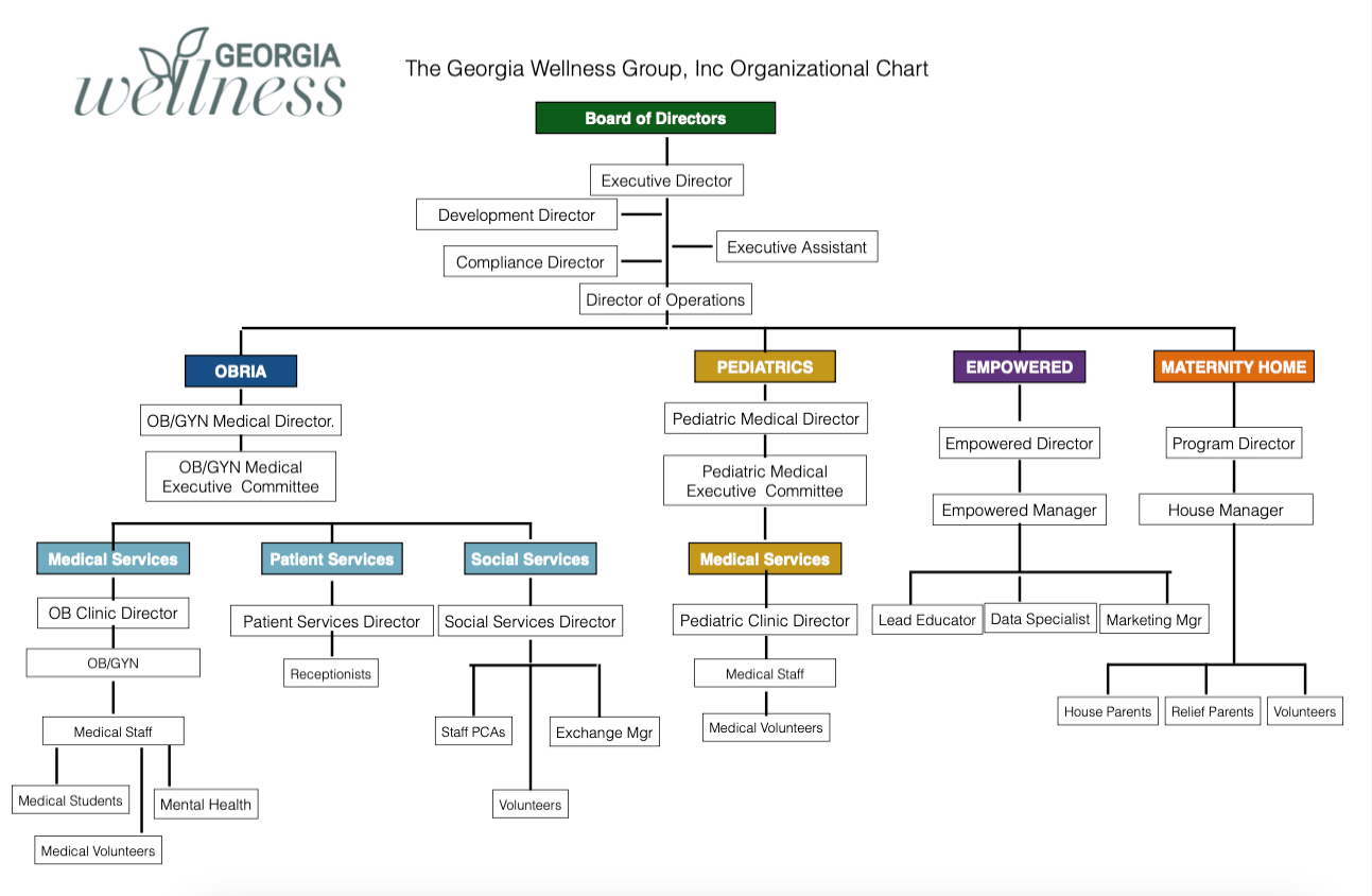 Surprisingly, the letter to Glass also asserted she defamed Georgia Wellness by saying it is affiliated with Obria, the national chain. According to the letter, “Georgia Wellness is an independent, locally operated clinic no longer affiliated with Obria on an organizational, legal, or operational level.” However, any observer could be forgiven for not knowing that. As of publication time, the website obriagwinnett.org was still live, featuring Georgia Wellness’ current phone number. The organization’s 2025 CDBG applications—submitted in July 2024—still use the name Obria throughout. In fact, in an organizational chart submitted with that application, “Obria” appears as an entire division of Georgia Wellness, encompassing all OBGYN services.