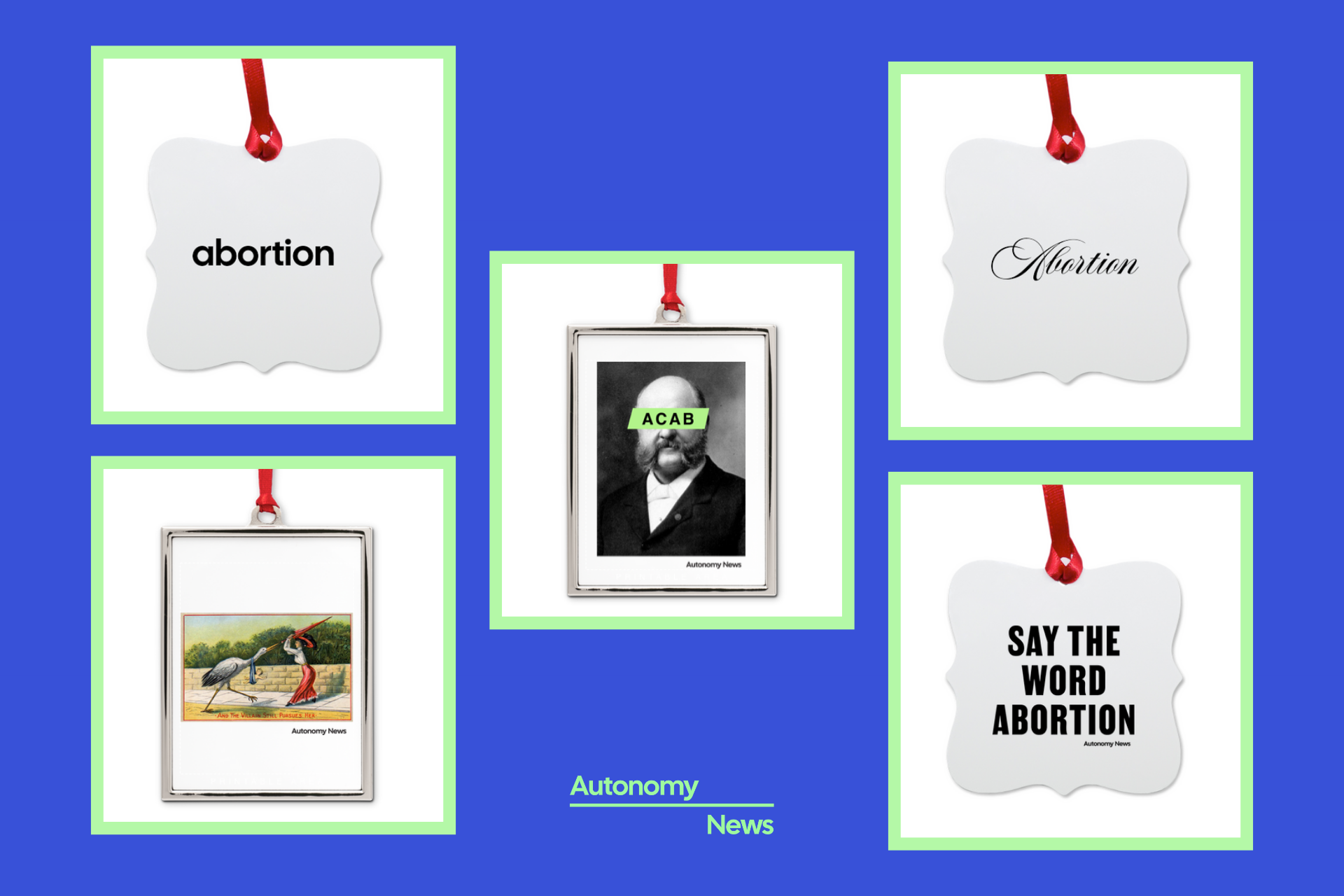 Our second merch drop is here—just in time for holiday gifting! We added five ornaments for decorating Christmas or holiday trees, including our best-selling All Comstocks Are Bastards and Bad Stork designs in a silver frame, and text-based designs printed on metal. If you ask us, these ornaments would make perfect stocking stuffers, or Secret Santa or white elephant gifts.