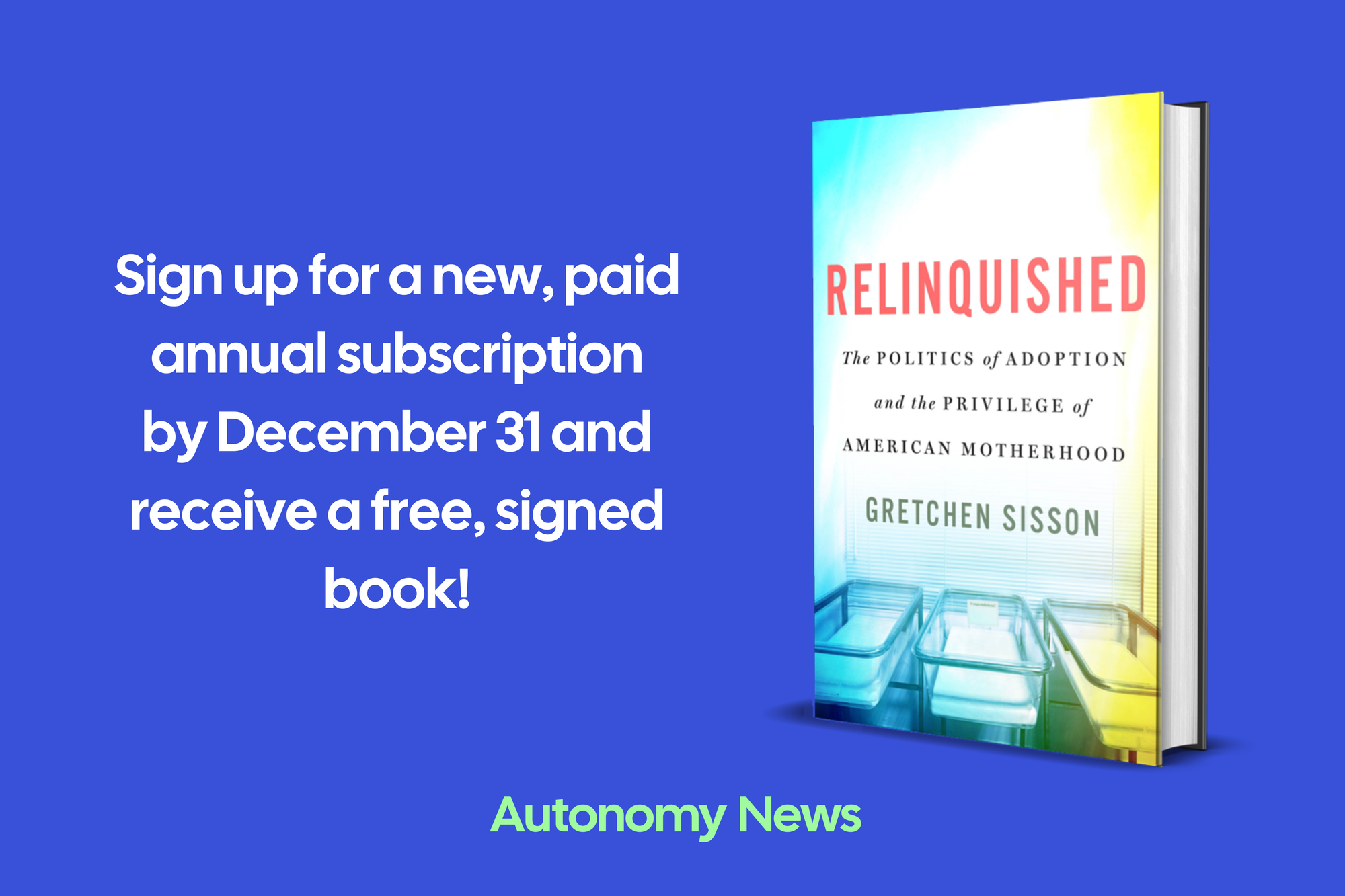 Another great way you can support us is by upgrading to a paid subscription. And remember, if you start a new, paid annual subscription before the end of the year, you’ll receive a free, signed copy of researcher and Autonomy News subscriber Gretchen Sisson’s book Relinquished: The Politics of Adoption and the Privilege of American Motherhood.